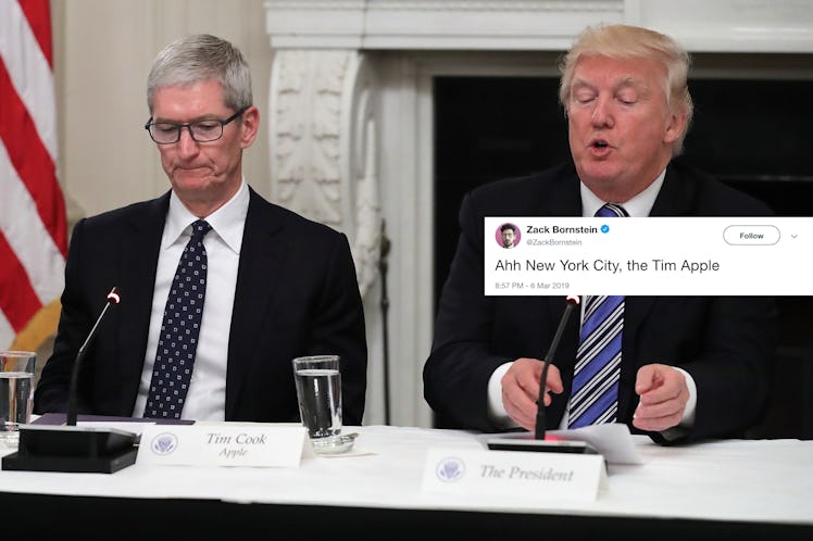 On Wednesday, March 6, Donald Trump and Apple CEO Tim Cook both attended a American Workforce Policy Advisory Board meeting at the White house, but despite their proximity to each other (and each other's name tags) at the table, Trump couldn't seem to remember Tim Cook's full name. In various videos posted to Twitter, the president seems to confuse Tim Cook with his brand, Apple. These hilarious "Tim Apple" memes about Donald Trump and Tim Cook highlight and poke fun at the mix-up.