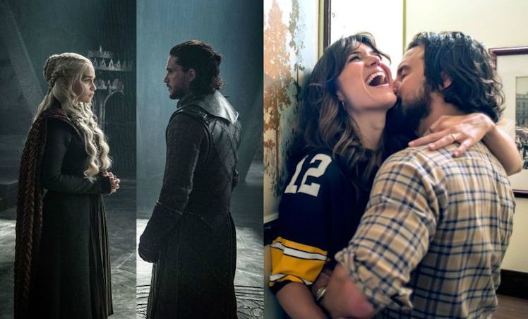 The fact that Daenerys and Jon Snow's costumes have changed throughout the series shouldn't deter anyone from doing them as a couple. Whatever Jon Snow wears now, most fans recognize him best when he's in all black with a Jon Snow wig, and the IKEA rug cape. Daenerys is a little harder, but the white fur coat is probably one of the simplest outfits she's got, just add a silver chain and a Dany wig.