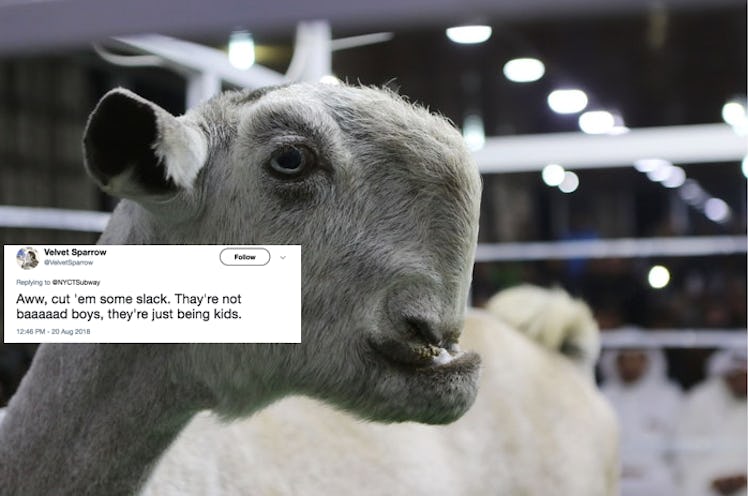 It all started when, shortly before 11:30 a.m. ET on the morning of Aug. 20, the MTA made an announcement via Twitter, saying there were two goats roaming along the N subway line tracks in Brooklyn, New York. They said that the two goats are safe and that their antics aren't, in fact, affecting service, but they reassured subway riders they'd keep everyone posted. Then, they started having some fun with it. The subway account proceeded to post a picture of the goats in question, calling them "baaaaad boys." Someone's having fun with their puns.