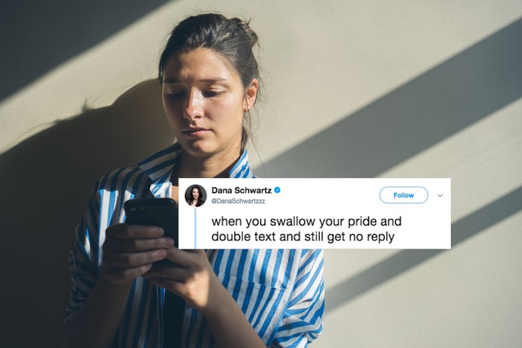 Everybody who has ever dated in the age of texting knows that sending a double text is pretty much seen as a big no-no (for literally no good reason whatsoever). Mustering up the personal strength to sacrifice your own pride and send that text is one of the most difficult things to do for a young person in the dating game (LOL), so you can only imagine how brutal it is when the second text isn't met with a response. Twitter user and Entertainment Weekly correspondent Dana Schwartz, @DanaSchwartzzz, posted a tweet that perfectly captured just how painful this really is. She wrote, "When you swallow your pride and double text and still get no reply," and paired it with pretty much the best image ever.