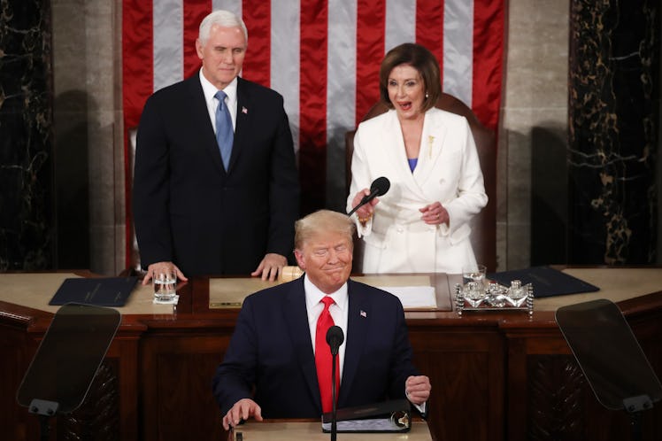 This isn't the first time Pelosi has gone head to head with Trump over the State of the Union. In January 2019, it looked like Trump wouldn't be able to deliver the annual address, because Pelosi refused to invite him to speak until the partial government shutdown at the time came to an end. The government shutdown did ultimately end on Jan. 25, 2019, and Pelosi invited Trump to make his address to Congress on Feb. 5, 2019. In 2020, despite impeachment proceedings against Trump, Pelosi appeared keen to skip the drama from 2019 and invited the president to speak, as per tradition. Pelosi did, however, omit some complimentary language from her introduction of Trump, per The New York Times, instead simply saying, “Members of Congress, the President of the United States.” Elite Daily did not immediately hear back from the White House or Pelosi's office about the reported handshake snub and altered introduction.