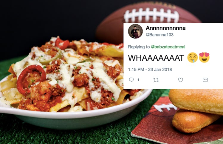 From hot wings to bean dip, there are a variety of classic dishes I'm definitely looking forward to inhaling this during the Super Bowl on Sunday. And among those dishes includes lasagna — as well as nachos — which ultimately leads me to investigate Olive Garden's latest Super Bowl-inspired creation. Their new dish features both nachos and pasta, but the tweets about Olive Garden's Loaded Pasta Chips show how truly torn Twitter is over the awe-inspiring innovation. Meanwhile, I'm totally already packing my Tupperware as I head over to the Times Square location, because that sounds like something I need to experience.