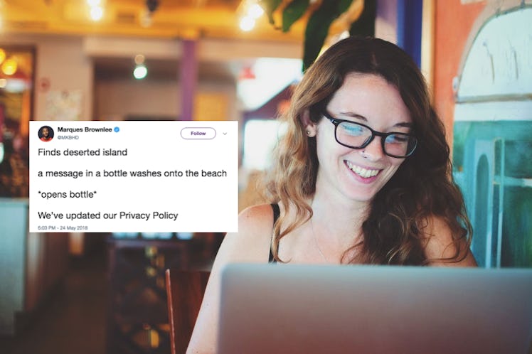 You're likely aware of the fact that data privacy has been a pretty hot topic in the news this past year, specifically in relation to questions over user data privacy on Facebook that arose earlier in 2018. But more recently, you've probably seen a slew of similar messages coming from any and every website you've ever used, that says, "We're updating our privacy policy." Honestly, there's a privacy policy update wherever you go in the cyber universe RN, and that's no exaggeration. So, in classic Twitter fashion, this monotonous and inescapable message has officially become a meme. If you haven't seen these tweets about privacy policy updates, they're ridiculously hilarious and are guaranteed to make your day.