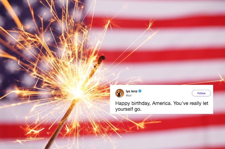 People have been tweeting all day about the 4th of July. Lots of tweeters are taking time to highlight things the country can improve on (a whole f*ckin' lot), to reflect on the happenings of the past year and how we can overcome them, and generally just trying to use Independence Day as a day of hope, but there are also lots of people trolling the nation by wishing America a very "happy" birthday. "Happy Birthday America" is currently trending on Twitter, and if you look through all of the tweets, you'll find a hilarious combo of tweets that show people basically saying "everything hurts and I'm dead inside."