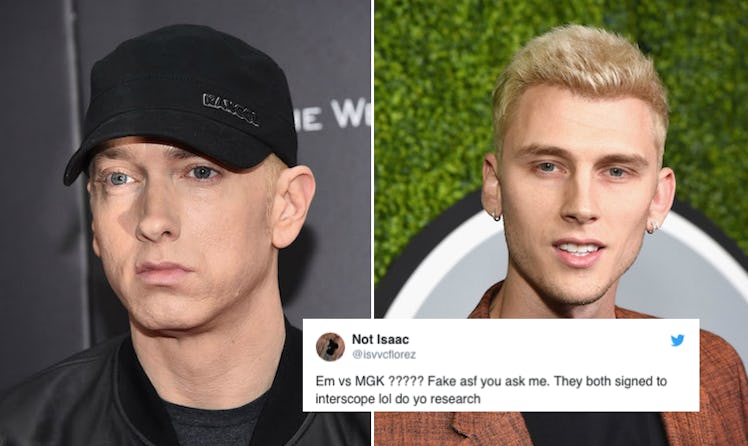 Fans on Twitter are now becoming full-on feud detectives, connecting some interesting dots, and are now speculating that Eminem and Machine Gun Kelly's feud is merely a publicity stunt, noting that the two rappers are both signed to the same record label, Interscope Records, and that they both used the same producer for each of their diss tracks. Elite Daily reached out to Eminem and MGK's teams for comment on the speculation, but did not hear back by the time of publication.