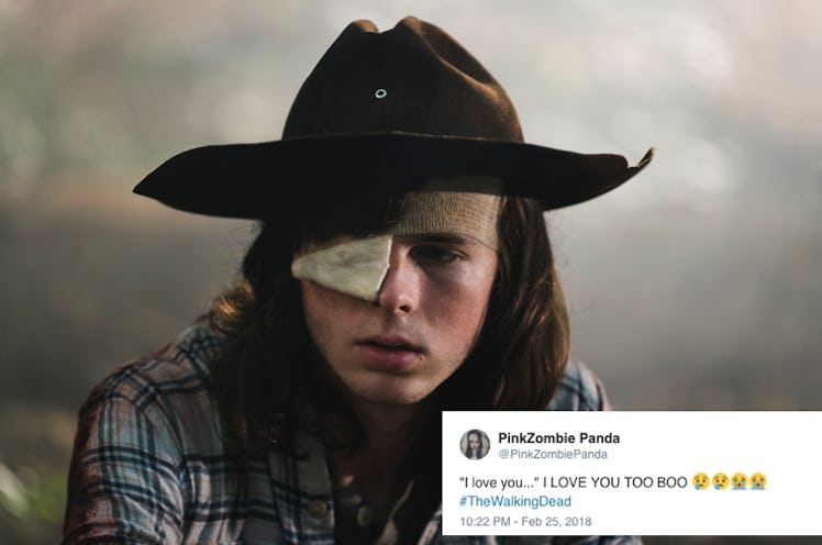 At long last, AMC's The Walking Dead has finally returned for the second half of the show's eighth season. Knowing that this week's episode was technically a "premiere" episode, fans knew to expect something major to happen. Although, when does something major ever not happen in an episode of this show? Still, the Feb. 25 episode really packed a punch. Spoilers for The Walking Dead Season 8, Episode 9 ahead. This week, we've suffered one of the worst losses in the show's history, and the tweets about Carl dying on The Walking Dead prove that his character will be sorely missed.