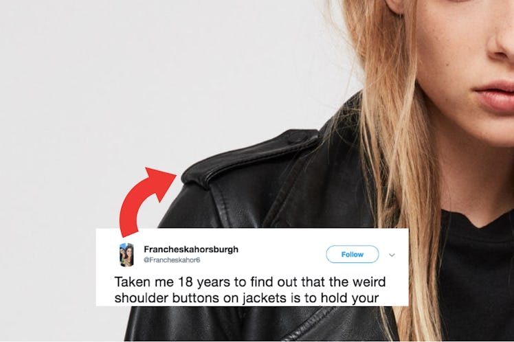 I've been on this planet for 28 years now, and I can say without a doubt that, today, I learned the most mind-blowing information I've ever received in my life. It's about one of my favorite pieces of clothing and I learned it from — wait for it — Twitter. But before you write me off as a clueless millennial seeking advice on social media, this is not only totally game-changing, but it's something I think most people don't know about, not even my parents. Sure, mom, you have taxes down, but do you know what the shoulder straps on jackets are for? Didn't think so!