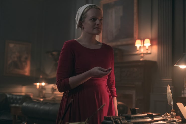 Last week's episode of The Handmaid's Tale ended with a shocker: Ofglen #2 blew herself up in a suicide bombing to destroy the new Red Center. This was a woman who in Season 1 insisted this life as a Handmaid beat her old one of drug addiction, and she would do nothing to screw it up. This week ended with a whole new rebellion, which leads to Serena Joy giving Offred a chance to do her old job again of copy-editing. What is June editing? And why is it Serena Joy who is making this offer? Warning: Spoilers for The Handmaid's Tale Season 2 follow.