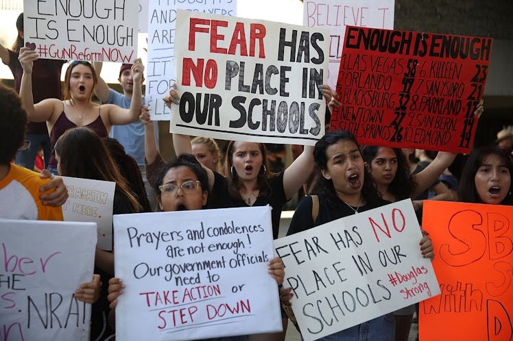 The march, which is demanding Congress improve gun control laws, was announced on Sunday, Feb. 18 — one day after students and parents rallied in Fort Lauderdale, Florida on Feb. 17 to call for major changes to gun laws to help prevent mass shootings, according to NBC News. The students adopted the hashtag #NeverAgain to mark their hope that this Parkland tragedy is the last mass shooting children will ever have to endure in a school setting in the United States again. Speaking in response to the argument that now isn't the right time to talk policy, a junior at Stoneman Douglas, Cameron Kasky, told ABC News,