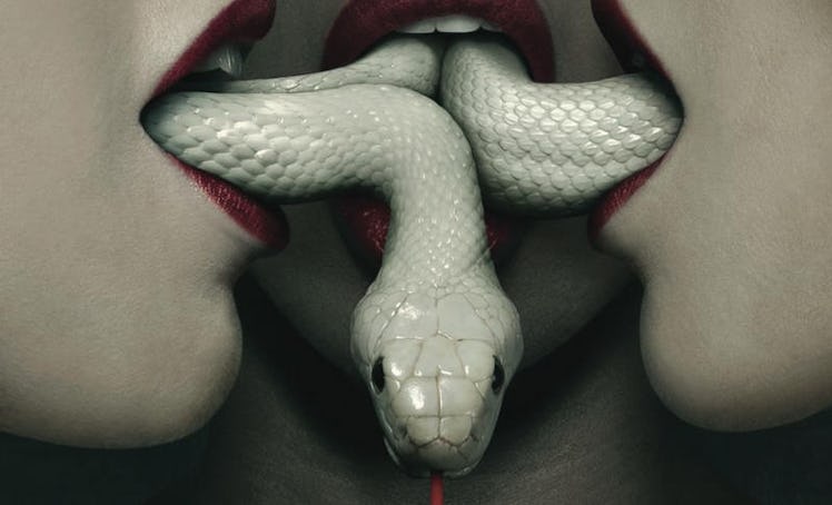 As fans know, snakes were a central element to the artwork for American Horror Story: Coven. Before Coven premiered, the season was teased with a bunch of posters and video clips involving snakes. The season's main poster showed a white snake pass through the mouths of three women.