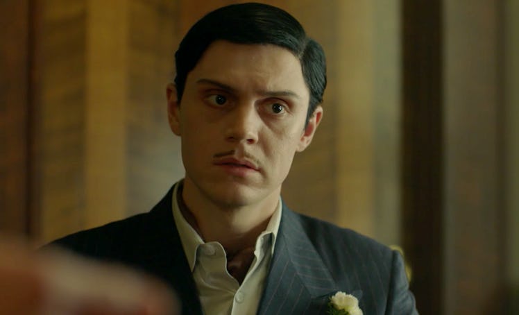 We also see that Queenie has made an unlikely friend during her afterlife in the Hotel Cortez: none other than the hotel's designer James March. Yep — Evan Peters brought back his pencil-thin mustache and his old-timey accent to play the ghost of James March, the serial killer whom we saw haunt the halls of the Hotel Cortez throughout AHS: Hotel. In case you forgot about him, James March originally designed the Hotel Cortez in the 1920s as a veritable playground of murder, filling it with secret dungeons and torture chambers where he could indulge in his passion for killing.