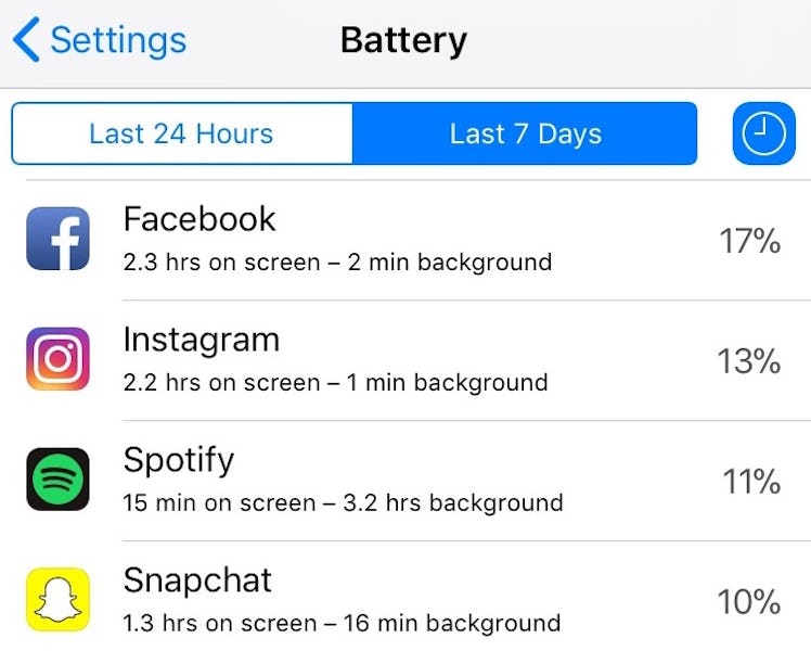 One curious Twitter user, @BrettSVergara, decided to check out his app activity in the iPhone's battery settings, and then he shared this hack for all of Twitter to see. Brett S. Vergara (who is a BuzzFeed community strategist, according to his Twitter bio) tweeted on Wednesday, Jan. 3 that he had learned how to find out exactly how many hours you spend on each app. All you do is go to "Settings" and then scroll down to "Battery." Then, you'll see two buttons that say "Last 24 Hours" and "Last 7 Days" (some users have the 4-day option, apparently). Next to those options, you'll see a clock icon. If you click on the clock icon, you'll see how many hours you've spent on each app. Clearly, the results weren't what Vergara was hoping for because he ended his tweet with "...and now I wanna die."