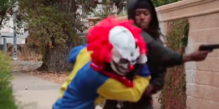 Of course, it's the clown in this video who ends up being the one running away, fearing for his life (and hopefully doing a bit of soul-searching as to what poor decisions led him to get hit across the face by a gun in the middle of the afternoon).