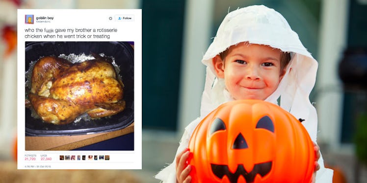 Now, if I received -- as an adult -- a rotisserie chicken on Halloween, like the ones distributed by Twitter user @boner_tricks, I would thank my lucky stars.
