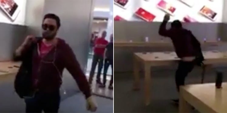 In the video, the man can be seen using an instrument to smash the screens of a number of perfectly displayed iPhones (RIP). Even as he received apparent shouts from store employees to cease and desist, the man continued to go ham.