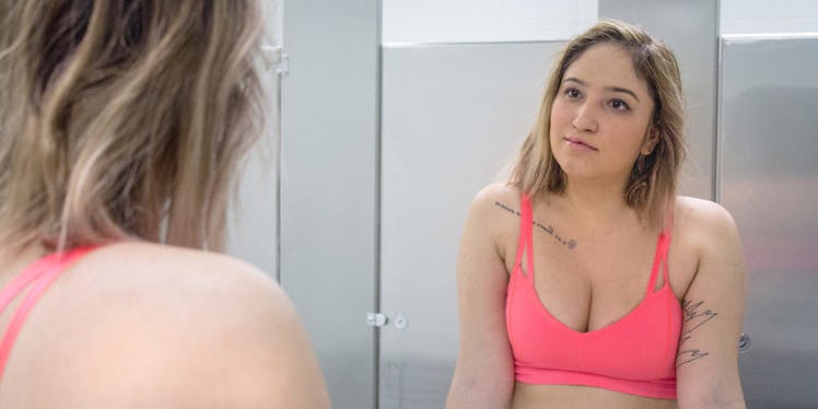 My walk through the gym to the women's locker room, despite the fact that my bra was covered up by a hoodie, felt more like a walk to the butcher shop. I knew, inherently, that no one was looking at me. That didn't stop me from zipping my hoodie up higher as a preventative measure. It's like these gym-goers knew I was about to commit some sort of aesthetic crime.