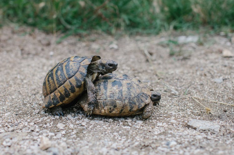 Sea turtles actually love it rough. While the female is swimming horizontally in the water, the male turtle mounts her. According to Live Science, the male turtle hooks his long, sharp nails into his lady's shell to hang on. Often times, this will cut up her skin. It's turtle BDSM.