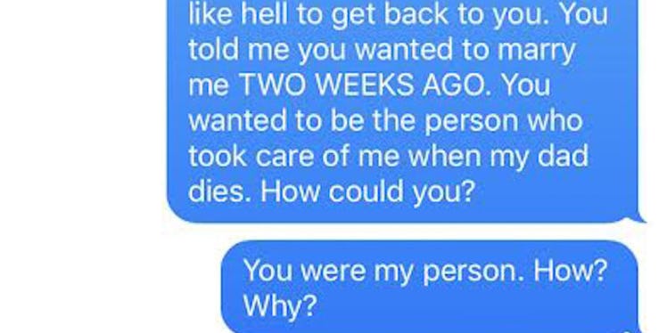 The fact that he had the nerve to be cheating on her just two weeks after offering to ask her dying dad for her hand in marriage?
