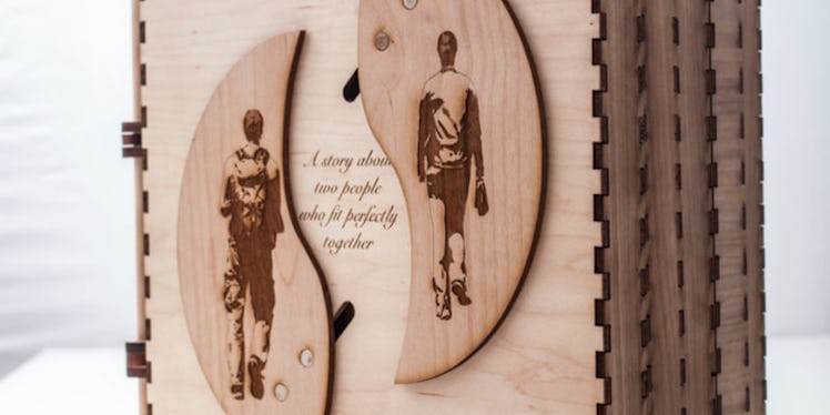 The book itself is eight pages. Half the pages have a story etched into the wood, and the other half are puzzles.