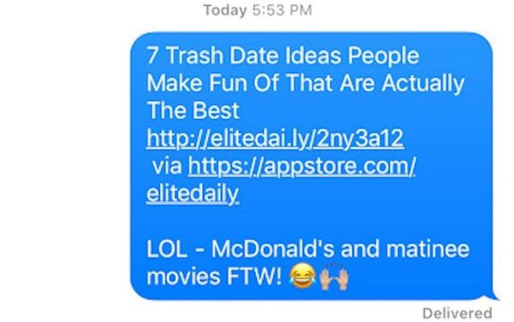 He didn't text me much that night, which is fine, and we didn't end up meeting up. We had talked about hanging out the following Sunday, but he never called. I saw on Snapchat that he was out drinking for Sunday Funday (again, totally fine), but I'm super into communication, so when I didn't hear from him, I was super bummed! I texted him Tuesday just to initiate a conversation and show interest, but it went nowhere. I haven't heard from him since! I texted him again the next week with a link to an Elite Daily article — '7 Trash Dates Ideas People Make Fun Of That Are Actually The Best' and made some comment like, 'McDonald's and matinee movies FTW!'