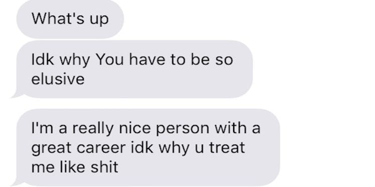 I had met this guy a couple weeks earlier at a bar and I thought we really hit it off. But then he blew me off a couple of times. And finally, after this last time, I lost my patience. Well, I didn't quite lose it, but my friends did. So I let them take my phone and send whatever they wanted. This is what they came up with. Needless to say, never heard from him again.