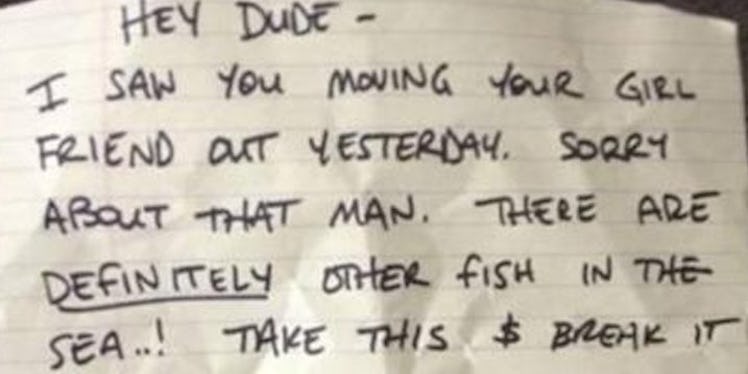 Clearly, I am a far worse person than one guy who noticed his neighbor's girlfriend moving out of their apartment the other day because instead of doing literally nothing about it (like I would have done), this neighbor left him a note AND MONEY.