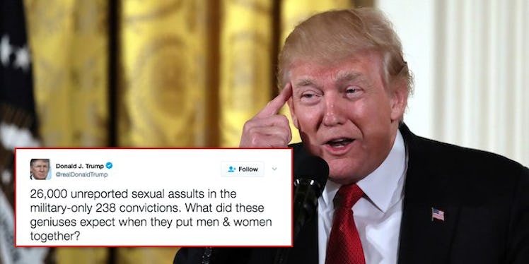 Trump, Your Royal Pussy Grabber, knows how to address sexual assault on Twitter. But when he takes a stance on the issue, it's not to address the allegations made against himself; it's to suggest that rape and sexual assault are inevitable whenever men and women are merely in one another's presence.