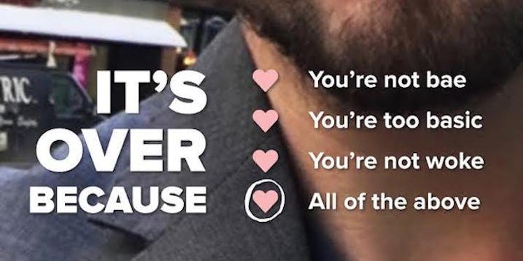 In one quick, 10-second (or less) selfie, you get all the info you need: 1) the fact that it's over, and 2) the reason why it's over.