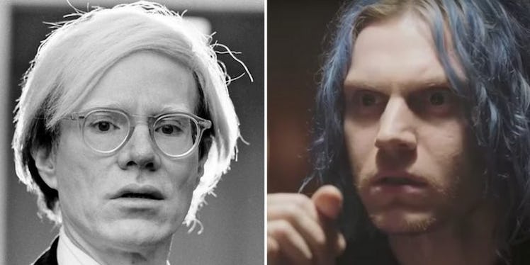 Apparently, we're going to be dealing with a lot of famous people in American Horror Story: Cult. Although teasers have made clear the new season will deal with a creepy cult of clowns, Ryan Murphy has said that it will include much more real events and people than you may assume from the out-there theme. For one thing, the season will kick off on the recent election night, and be influenced by Trump's election as President of the United States. The other main root in reality looks to be the ensemble of real-life cult leaders that Evan Peters will somehow portray, according to Murphy. Although Peters is cast in the fictional role of Kai Anderson, Murphy recently revealed the actor would also be playing a bunch of actual cult leaders, such as Charles Manson, Jim Jones, and Andy Warhol. Now, that last name may throw you for a loop, and wondering: Did Andy Warhol have a cult? Here's everything you need to know about the eccentric pats of Warhol's life that we may see Evan Peters playing on in AHS: Cult.