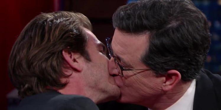 Colbert then asks if Garfield feels comfortable kissing men, because he does. You know, one thing led to another, and before we knew it the two were doing the lip dance all over our TV screens.