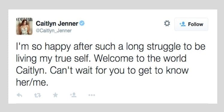 I'm so happy after such a long struggle to be living my true self. Welcome to the world Caitlyn. Can't wait for you to get to know her/me. — Caitlyn Jenner (@Caitlyn_Jenner) June 1, 2015