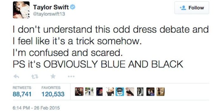 I don't understand this odd dress debate and I feel like it's a trick somehow. I'm confused and scared. PS it's OBVIOUSLY BLUE AND BLACK — Taylor Swift (@taylorswift13) February 27, 2015