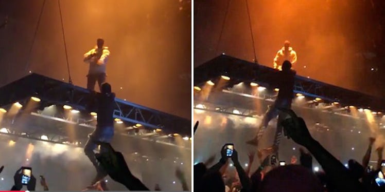 One fan knows this classic advice well, which is likely why he leapt from his spot in the general admission pit and latched on to Yeezy's suspended, traveling stage for a brief, miraculous moment.
