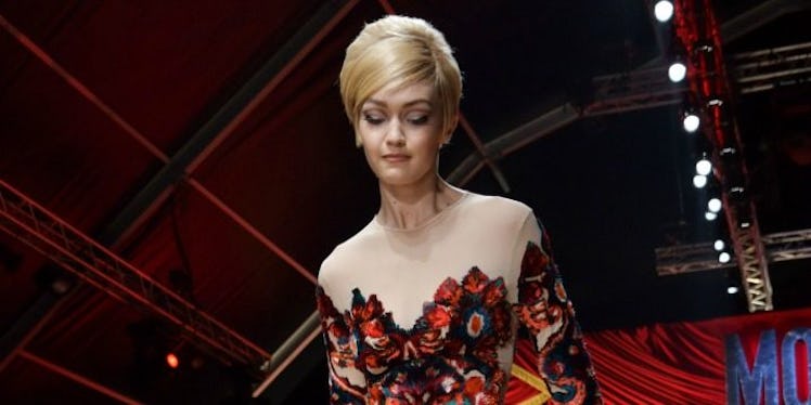 Without further ado, here's the first shot of Gigi Hadid's Moschino fashion show fail.