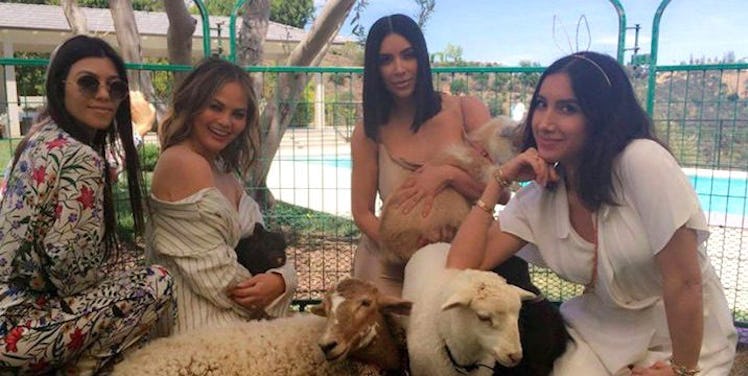 In the photo (which will totally give you FOMO), Kim K, Chrissy Teigen and Kourtney Kardashian are chillin' with piglets and lambs in the backyard of her home.