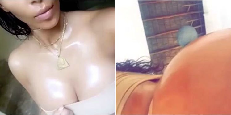 First, after showing off how closely her butt resembles the peach emoji in a skin-tight, sheer orange dress (while on a boat, of course), she shows off this nude bikini and oiled up skin.