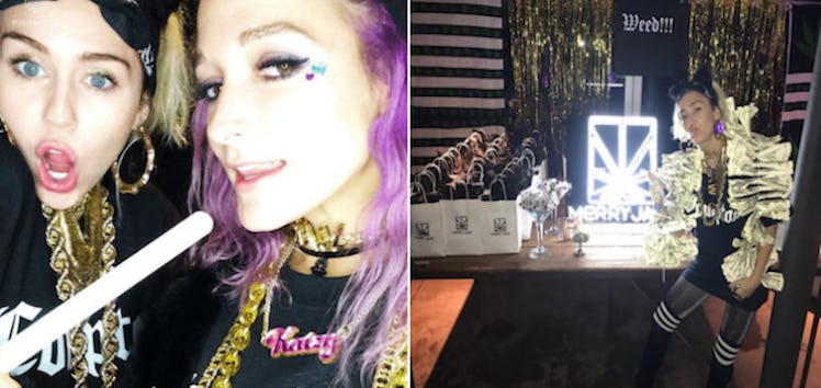 Their Compton-vibe party paired perfectly with favors from Merry Jane, a media lifestyle company founded by Snoop Dogg. Miley struck a pose near a table of Merry Jane party favors, dressed in heavy gold chains with a joint hanging out of her mouth.