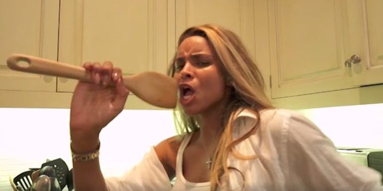 She starts the clip in her kitchen, presses play and grabs a wooden spoon to use as a fake microphone. (We've all been there.)