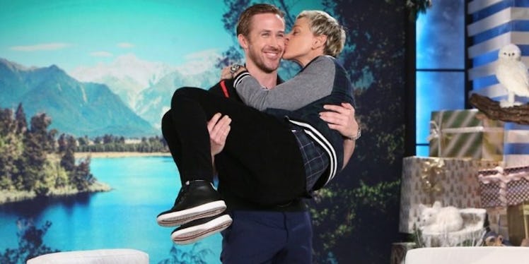The 36-year-old actor started the party off by criticizing Ellen DeGeneres' greeting, which inspired the host to jump into Gosling's arms and give him a great big kiss on the cheek!