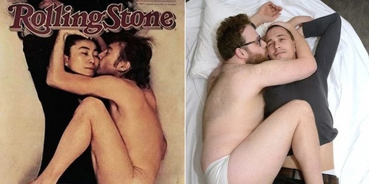 In the photo, the two men reenact the iconic John Lennon and Yoko Ono Rolling Stone cover.