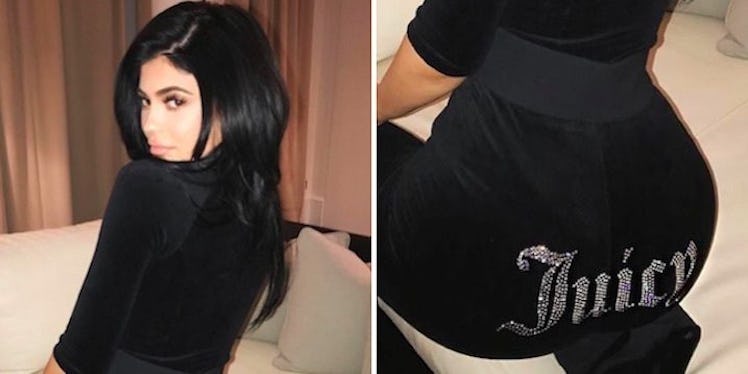 In the photos, Kylie looks absolutely flawless as she poses in a pair of black, high-waisted velour sweat pants that are bedazzled with the word "Juicy."