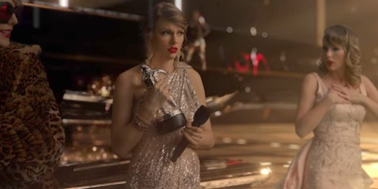 However, my mouth dropped when the Taylor Swift from the 2009 MTV Video Music Awards said her final line of the video. At the end of the clip, she's shown wearing the same sparkly dress she wore eight years ago while accepting the Best Female Video award, and looks around with the same facial expression she had when Kanye interrupted her acceptance speech.
