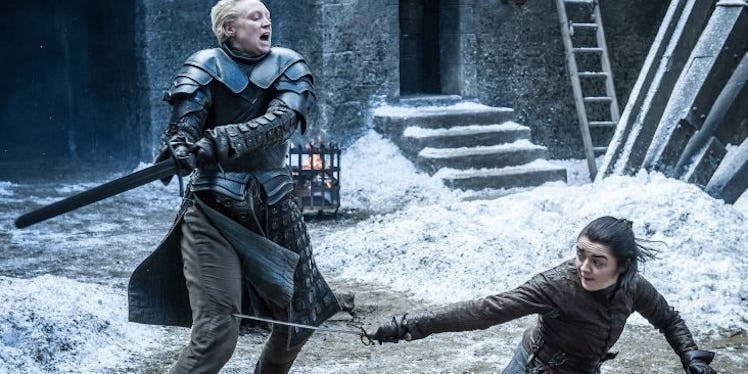 Game of Thrones is known for two things: fan theories and references. This week's episode was filled with gems, like the scene in the cave with the drawings by the Children, as well as an excellent fight between Brienne and Arya, not to mention the best battle of the season so far between Lannister and Targaryen. But that's not all! There are several Game of Thrones Season 7 Episode 4 Easter eggs in this week's episode, "The Spoils of War."