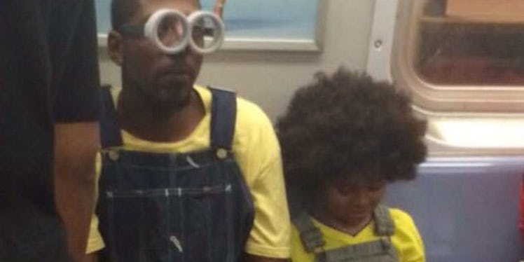 The photo was posted to Reddit, and although I can't confirm this is actually a father-son duo, I can assume -- barring the world's greatest coincidence of all time -- this kid didn't just happen to be sitting on the subway next to some random dude wearing the same costume as him.