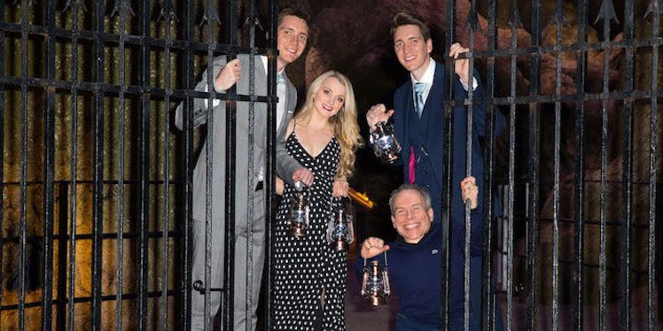 Actors Evanna Lynch, Oliver Phelps, James Phelps and Warwick Davis reunited for a photo op for the grand opening of the Forbidden Forest exhibit at the Warner Bros. Studio Tour in London.