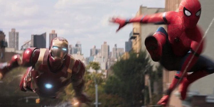 You may recall in the official trailers for Spider-Man: Homecoming there are some scenes of Peter Parker in full Spider-Man costume swinging through the air while a fully-costumed Iron Man flies next to him. It's an epic shot that definitely got fans pumped for the film. But if you're sitting in theaters, waiting for that shot to come, don't hold breath — because it never comes.