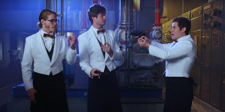 In the short teaser, we see the three dudes dressed in white suit coats (Are they waiters?) as they light up joints with gun-shaped lighters. Or at least Blake and Anders do... Adam finds out the hard way that he actually has a real gun!