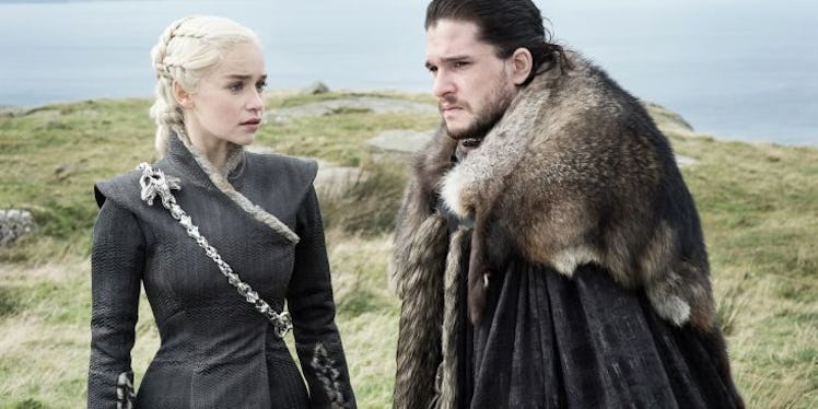 This post contains spoilers from the Game Of Thrones Season 7 finale. Tonight's finale of Game of Thrones Season 7 gave us a triple whammy: birth, sex, and marriage. We got to see Rhaegar and Lyanna marry for love in the midst of war. We saw Lyanna name Jon Snow on her death bed, his real name, Aegon Targaryen. But most inevitably, we saw Jon Snow and Daenerys Targaryen disappear behind the door and spend the night together. And with no birth control in sight, here's the question everyone is asking: Is Daenerys pregnant?