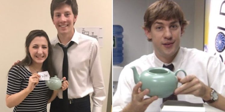 For starters, Davis put on some Jim cosplay to make himself look as Scranton-y as possible. He then gave Cameron a green teapot with a note that read "Prom?"