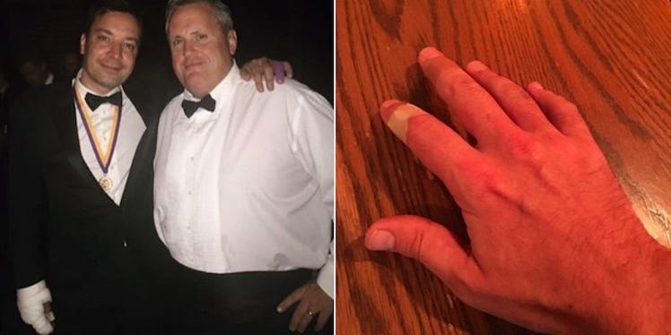 A few months ago, "The Tonight Show Starring Jimmy Fallon" host hurt his finger in a serious kitchen accident. This past weekend, his hand was injured again.